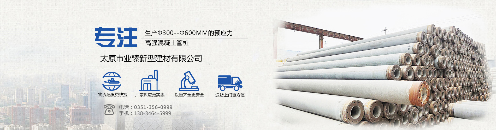 太原市業臻新型建材有限公司是山西省生產高強度預應力混凝土管樁的大型企業。公司緊臨108國道與太原市西北環高速公路,交通便利,輻射深遠。公司擁有完善的質保體系與生產工藝及裝備,科學嚴謹的管理模式和銷售服務。公司坐落在太原市尖草坪區綠果路8號,公司占地面積120.....【了解更多】